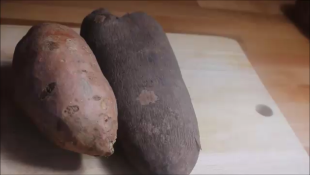 - Add the peeled yam and sweet potato and bring to boil and cook until soft – about 8 minutes